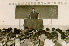 * Reverend Moon speaking at the Special Celebration attended by all members held in honor of their Return to Korea after the Third World Tour