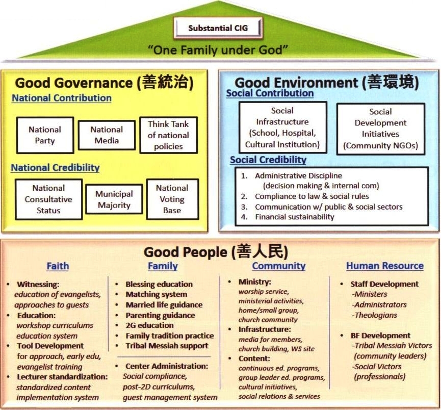 Since we have covered the perspective of the development of growth through stages, I would like to move on to another perspective, which is that of components and elements of growth. A nation is often said to require three components; namely, government, territory and people. In order to make Cheon Il Guk or a nation of peace, we can say that our initiatives in our countries should be composed of those that develop good governance a good environment and good people. We in the international headquarters tried to break the components down into smaller elements. (See diagram 3) This model is a work in progress, and is an attempt to give you an overview of the elements we need to pay attention to.