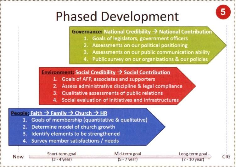 All these ideas are not new to you, I am sure. As I said, these are from what I heard and learned from our leaders and elders in world missions. I am just laying the components and elements out. What I wanted to stress was the importance of balanced growth. Please ask yourselves, how is the balance in your organizations? What is missing and what is being overinvested into, compared to the other elements? Which elements are urgent? After asking these questions, please think of what you want to maintain or add focus to in the next two to three years. You don't have to do everything at the same time, but I recommend working on the elements starting from the area of people; that is, from faith, family, community and human resources and then work your way through social credibility, social contribution, and finally the national elements.