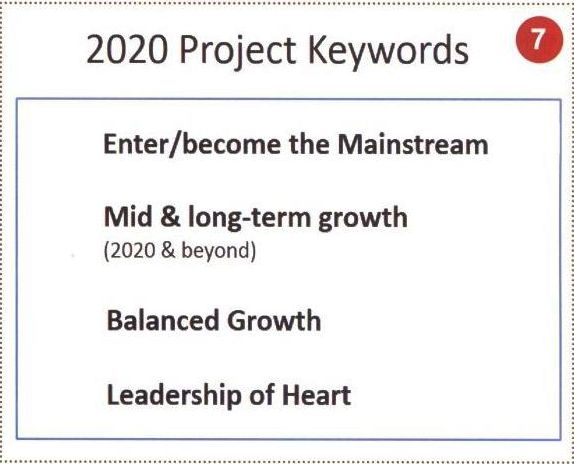 I intended to confirm our consensus and build some kind of framework, so that it will be easier to set goals and assess outcomes. As you can see, the keywords of our vision 2020 project are "becoming or entering the mainstream," "balanced growth," "mid- and long-term growth" (that is, growth to be achieved by 2020 and beyond 2020) and "leadership of heart." True Mother recently spoke about rebuilding the community of heart, caring for members and those in our second generation. Looking back, True Father genuinely cared about people be they our members, Korean citizens, Christians and people under communism and so on. I firmly believe that caring for our members and for our neighbors are the fundamentals of our identity and the basis for all our successes. Our job as leaders is to translate our love, heart, revelations and inspirations into initiatives and systems that are relevant to the lives of our members as well as our neighbors in our respective countries and mission areas. We stand on the historical foundation of the sincerity expressed by God, True Parents and all our predecessors. Let us move forward with life-or-death determination and provide a substantial offering to Heaven within the next six years.