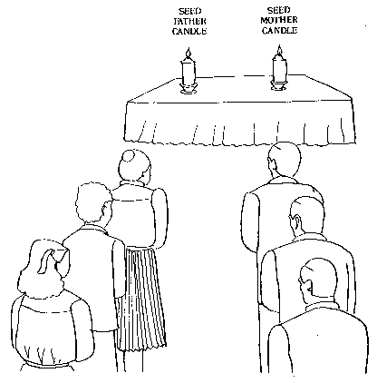 The flames of each pair of candles in the corresponding positions (i.e., the candles in the Adam position of both Father and Mother formations, etc.) should be joined together for a moment (diagram 17.8).