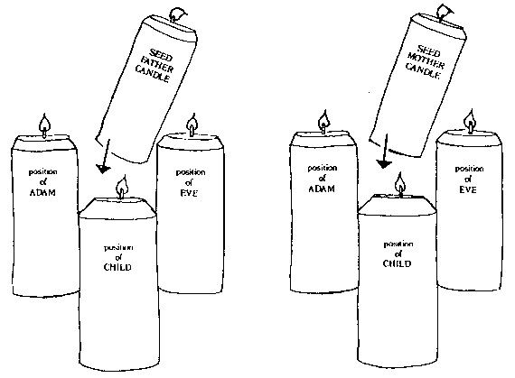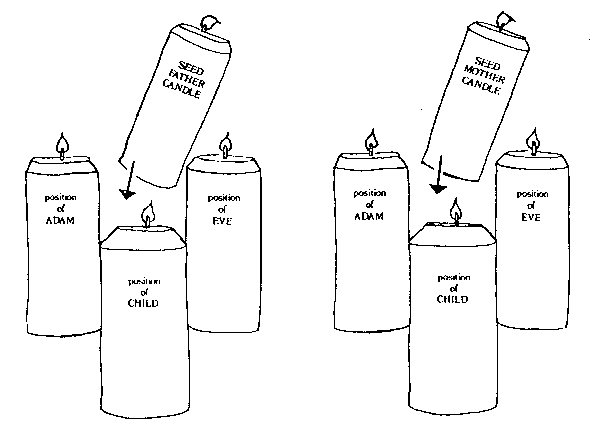 17.6. The "Seed" Father and Mother Ae Chun Candles are taken from God's position to light the new candles in the positions of Adam, Eve. Child