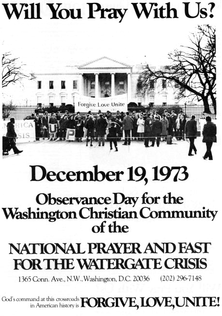 Asserting, "God’s command at this crossroads in American History is to Forgive, Love, and Unite," Rev. Moon’s "Answer to Watergate" statement appeared in full-page advertisements purchased in newspapers in each of the twenty-one cities of the Day of Hope itinerary, including the New York Times and the Washington Post, beginning November 30, 1973. Over the next two months, it was published in one newspaper in every state except Hawaii. In addition, The National Prayer and Fast for the Watergate Crisis Committee (NPFWC) organized vigils, rallies, letter-writing and leafleting in all fifty states to publicize its theme and to obtain signatures of people promising to pray and fast for the Watergate crisis. At least eight senators and fifty-three congressmen either signed the statement or responded with messages of support. Congressman Guy Vander Jagt (R-Michigan) read Rev. Moon’s Watergate statement into the Congressional Record of December 21, 1973.