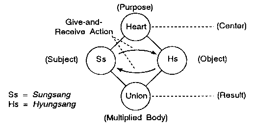 In the Original Image, the Original Sungsang and the Original Hyungsang engage in give-and-receive action, centering either on Heart or purpose, and form a union or a new body. When that takes place, the give-and-receive action can be regarded as occurring in three stages, namely, the stage of Heart (or Purpose), which is the Origin (Chung); the stage of the Original Sungsang and Original Hyungsang, which is the Division (Boan); and the stage of either a united being or a new body, which is the Union (Hap). This is called Chung-Boon-Hap action. The Unification Principle states that "God is the absolute reality, the existing neutral center of the two essentialities; therefore, He is the reality of the number three." 21 This statement is a direct reference to Chung-Boon-Hap action.