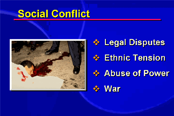 Conflicts in society take many different forms: from political, economic and ideological disputes to ethnic and religious strife. These may lead to abuse, injustice, aggression and even war. Many parts of the world experience ongoing conflict.
