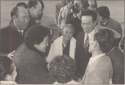 Mr. Yoon then led Reverend Moon over to where his family was waiting. A number of relatives were gathered there, including those he had last seen some forty-eight years earlier, such as his elder sister, Hyo Soon Moon (73), his younger sister Hyo Son Moon (64), his sister-in-law Chi Sook Ji (Reverend Moon's elder brother's wife, 69), and his nephew Byung Hyun Moon (49). They held on to Reverend Moon's sleeves and buried their faces against his chest, weeping loudly.