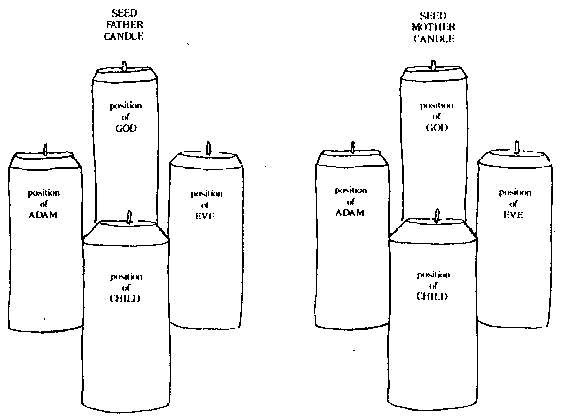 Candles. Two four positions are formed (diagram 17.4). The "seed" Father and the "seed" Mother candles bequeathed to each couple are placed in God's position. Three new candles are to be placed in the positions of Adam, Eve, and Child for each of the four position foundations made.