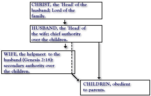 Mrs. Billy Graham praises Larry Christenson's book The Christian Family saying it is"a superb guidebook for the Christian home." He writes,"'Divine Order' is an order of authority and responsibility which is spelled out in the Bible. ... God has ordered the family according to the principle of 'headship.' Each member of the family lives under the authority of the 'head' whom God has appointed." He then gives the following diagram that shows these vertical relationships.