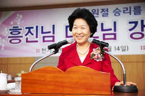 Hoon Mo Nim never sleeps or takes a nap during the daytime. So, even now, people came from far away, from South America or Oceania, so please do your best and erase your fallen nature. Every day, True Father appears to Dae Mo Nim and he told her: he wishes everyone has one heart, one mind, one body, one mindset, so that is True Father's wish for us. We need to obey True Parents, and erase fallen nature, and live a Principled life. We need to inherit a Principled way of life. That way, we can meet Foundation Day well. We have to live well in the CIG age. We can become heavenly sons and daughters of God and True Parents. Now, the Unification Church has changed to FFWPU, so we need to make lives centering on true love, and give everyone happiness, and live for the sake of others, and give heavenly fortune to other people. Dae Mo Nim wants to give much grace and great blessing during the Special Great Works workshop, so please have a repentful heart, and do chanyang well. I will close here. Thank you very much.