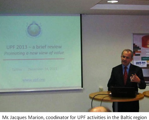 Mr. Jacques Marion, coordinator for UPF activities in the Baltic region, ended the session with a brief presentation of UPF's activities in the region in 2013 and its vision of promoting strong family values in an environment where confusion over marriage is rising. In Europe-Eurasia relations, he concluded, Europe tends to claim the teacher's position on democratic values – but increasingly on issues dealing with the family, Eurasia seems to be in a stronger position to teach its neighbor.