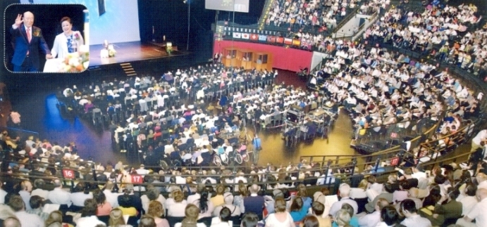 The biggest challenge for us was to fill the hall, which holds three thousand seats, on two consecutive days. We announced the performance less than a month in advance. However after three weeks all the tickets, more than three thousand five hundred, were already ordered. We had not even started our poster campaign. We could not give out any more tickets but started to explain that ticket holders had a chance not only to see the Little Angels but also to listen to the Founder's Address directly the following day. In the end, the hall was completely packed on both evenings. The first evening, True Parents were in the front row watching the Little Angels performance. "This is the first time in forty-seven years that True Parents have watched the program from beginning to end," Dr. Bo-hi Pak shared with us later. True Father did not leave the hall even during the intermission. He wanted to stay there. For me this was the most moving moment: to see Father sitting there, radiating his love with a full crowd behind him. We had all hoped for such an appropriate audience to welcome the Messiah.
