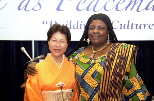 The Water of Peace ceremony brought eight women brilliantly dressed in their native attire, representing the diverse cultures and continents of the world. One by one they poured a glass of water into a common vessel signifying the unity of life and the common desire of women to work together for peace. The blowing of the conch shell in the Hindu tradition by Minister Gupta of India, who stood with his wife, recognized the female deity as the source of life. Other nations represented were Pakistan, Qatar, Haiti, Ethiopia, Israel, USA, and Japan.