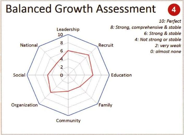 All these ideas are not new to you, I am sure. As I said, these are from what I heard and learned from our leaders and elders in world missions. I am just laying the components and elements out. What I wanted to stress was the importance of balanced growth. Please ask yourselves, how is the balance in your organizations? What is missing and what is being overinvested into, compared to the other elements? Which elements are urgent? After asking these questions, please think of what you want to maintain or add focus to in the next two to three years. You don't have to do everything at the same time, but I recommend working on the elements starting from the area of people; that is, from faith, family, community and human resources and then work your way through social credibility, social contribution, and finally the national elements.