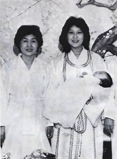 Nan Sook Nim and her new daughter, Shin Jung Nim. She is pictured with her mother, Mrs. Hong. Hyo Jin Nim returned to New York for the baby's birth, but is now back in Korea.