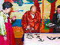 Sun Myung Moon and Hak Ja Han write the motto, "Let our family
