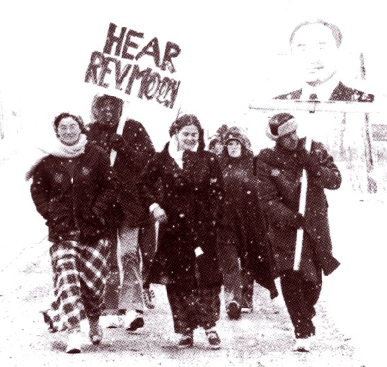 IOWC Members march through the snow for Rev. Moon's American 1973 speaking tour.