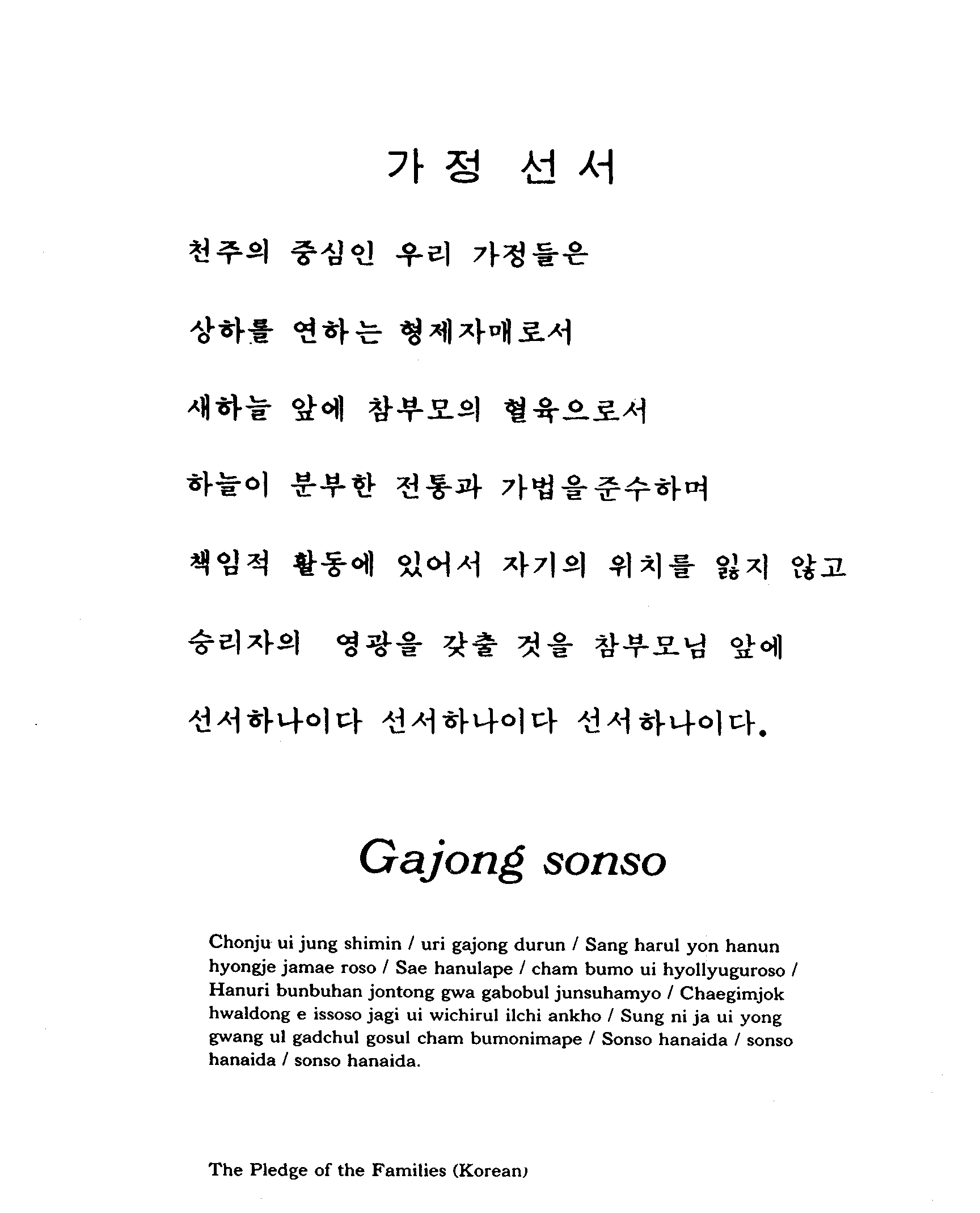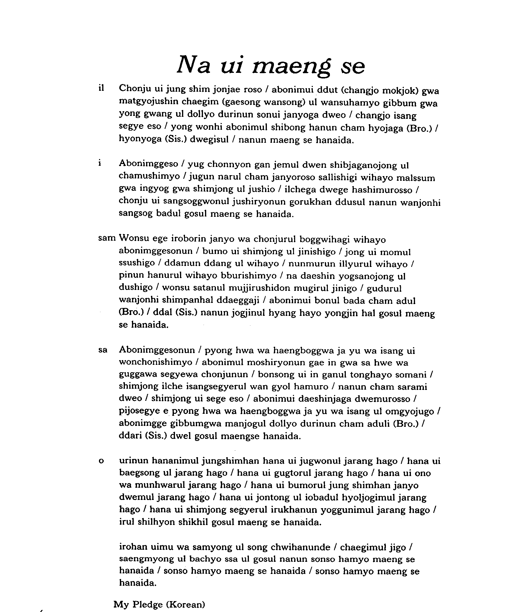 Korean content. If possible, recite all five points of My Pledge in Korean. Although it is appropriate to do so each time Pledge is recited, it is not mandatory. It is especially good to recite at least point five of My Pledge in Korean during the celebration service on each Holy Day.