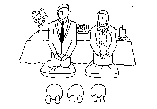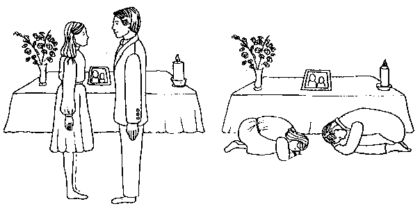 The husband and wife should then face one another, offer one full bow to each other (refer to diagram 4.2), and sit down (on the floor or cushions) facing their children. One child should lead all other