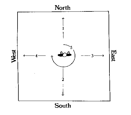 Toss a small quantity of the salt toward the north wall of the room. Next toss the salt to the south, east and west. From the center of the room spread the Holy Salt in a circle as a condition to cover the entire room (diagram 8.5).