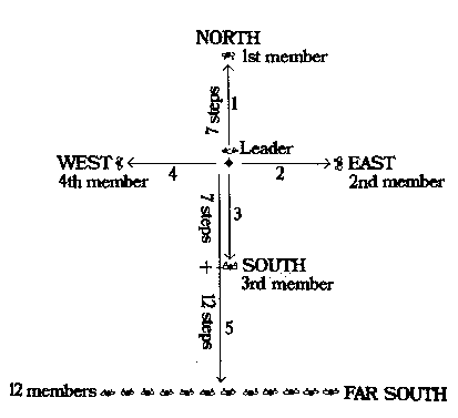 After the leader returns to the central point from the west, he or she should face south and then walk to the far south position (an additional twelve steps from the south position (9.1-5). Twelve members (if that