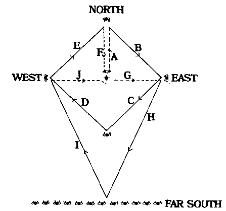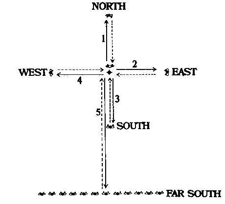 According to diagram 9.2, the leader should take Holy Salt and walk the seven steps to the north (9.2-1), sprinkling it as he goes. He should then return to the central point, and sprinkle Holy Salt as he walks seven steps to the east (9.2-2), and return once again to the central point. This same format should be followed going to the south (9.23), west 9.2-4) and far south (9.2-5) and return to the central point.