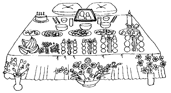 Diagram 14.2 shows a sample of the necessary types of foods to purchase (although fruits and other foods may be substituted according to the season or availability), as well as their correct placement on an offering table for the True Parents or True Family.