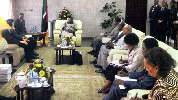 President Veronica Macamo at her office; also present are other