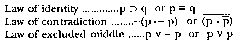 Through the combination of these five basic forms, any complicated deductive inference can be accurately expressed. For example, the basic laws of formal logic, namely, the law of identity, law of contradiction, and law of the excluded middle, can be symbolized as follows: