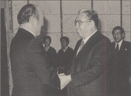 Reverend Moon listened carefully, attentively, and then responded. "President Kim, I'm deeply impressed with your spirit of love for our people. With such a spirit, what is there to prevent dialogue among the Korean people? And unity within the Korean people has to begin with dialogue. Up until now, the dialogue between North and South has been taken up only to be broken off and then broken off again, but I believe that the dialogue can enter a new stage from this point on. Of course, as I mentioned before, I do not represent any government authority. It is vital that the two governments sit down together and hold deep discussions and reach agreement in the same spirit as we are sharing now. Also, if you, Mr. President, came to Seoul and met with the leadership of the South, that would bring about great advances for the cause of peaceful reunification."