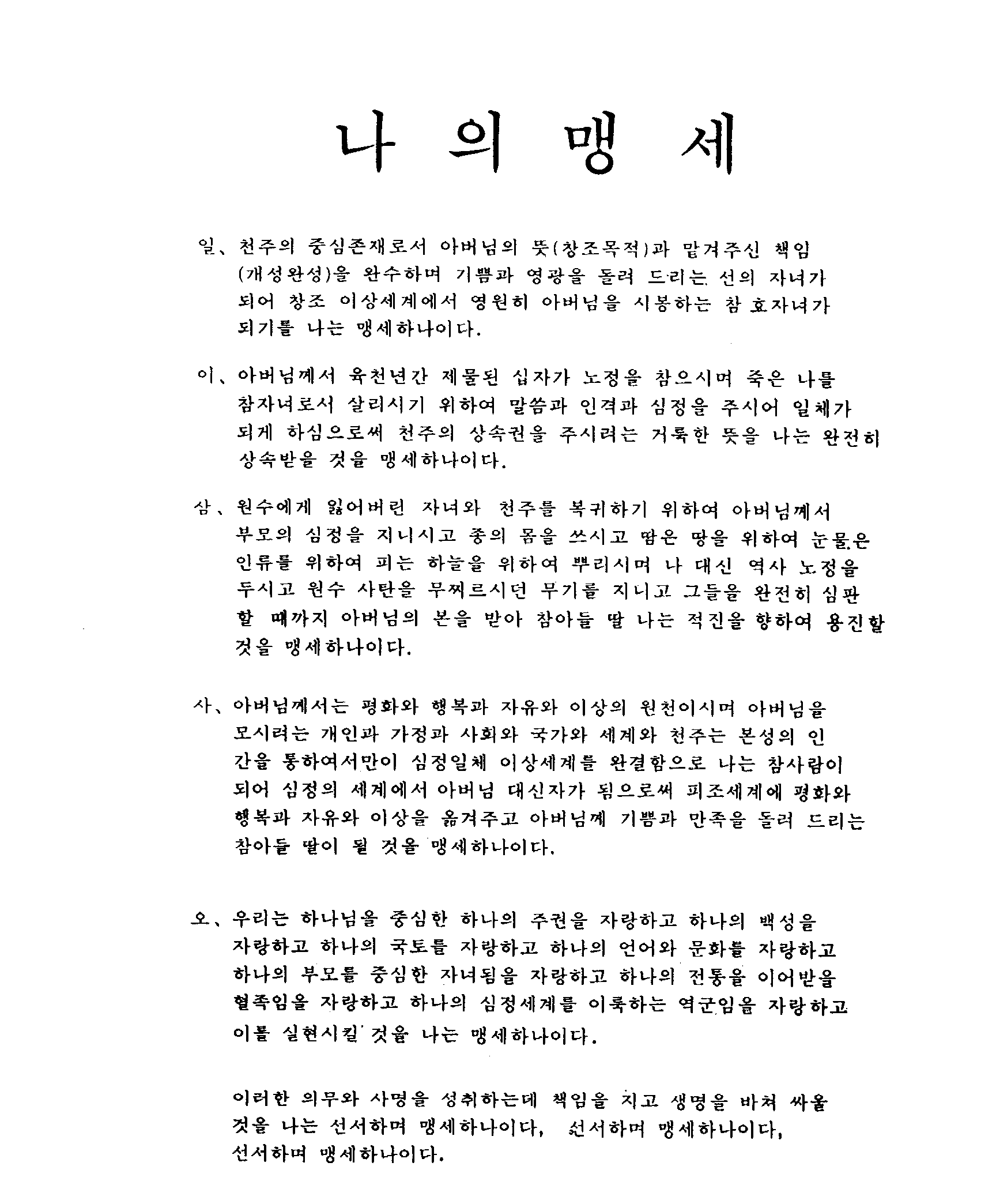 1. As the center of the cosmos, I will fulfill our Father's will (purpose of creation), and the responsibility given me (for self- perfection). I will become a dutiful son (daughter) and a child of goodness to attend our Father forever in the ideal world of creation (by) returning joy and glory to Him. This I pledge.