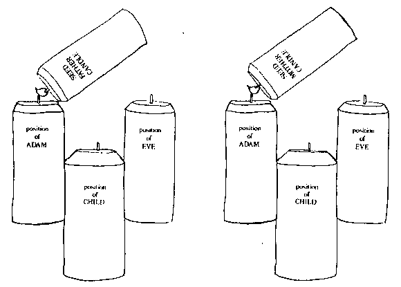 Candles. Two four positions are formed (diagram 17.4). The "seed" Father and the "seed" Mother candles bequeathed to each couple are placed in God's position. Three new candles are to be placed in the positions of Adam, Eve, and Child for each of the four position foundations made.