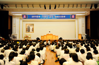 The 'Prayer of Gratitude' where members offer their final gratitude to Heavenly Parents and True Parents of Heaven, Earth and Humankind for their existence during the Special Great Works was held on the last day after the evening Chanyang Session from 8:00 pm at the Main Hall of Cheonseong Wanglim Palace (Heavenly Palace). The prayer started with Rev. Jae-sun Choe, Director for the Progress Department, as the emcee with the singing of Cheon Il Guk anthem, 'Grace of Holy Garden'. The members then offered a sincere unison prayer to express their gratitude to the grace they received during the 'Special Great Works to Commemorate the 18th Anniversary of Chung Pyung Works'.