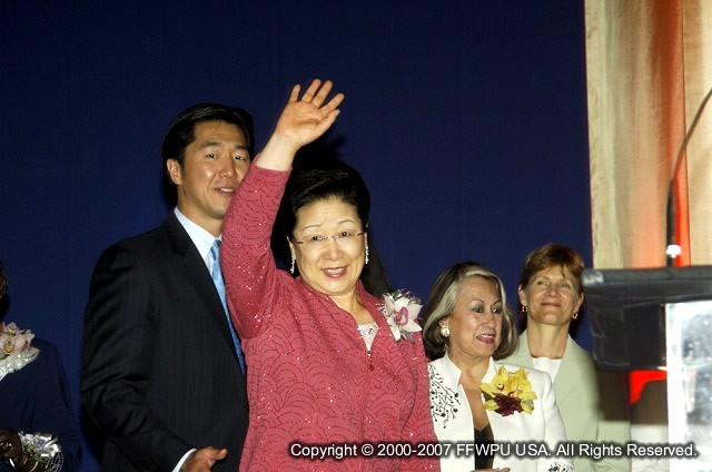 Mother's presence was profoundly beautiful and totally at peace. The audience followed her message very closely and they could not contain the applause as Mother said, "Victory came because God had chosen and raised the United States of America as the second Israel, in accordance with the plan for His providence, and had raised and trained the American people through Christianity... The responsibility, within God’s providence, to bring harmony and oneness among the world’s 6.5 billion people and to expedite the creation of a peaceful, ideal world, is on America’s shoulders. These are not simply the words of Rev. Moon. This is Heaven’s decree... " Concerning the establishment of ideal families Mother said, "The path is now wide open for humanity to find and establish true families. The family sets the pattern for living together in harmony. The warm environment of oneness based on love and respect between parents and children, mutual fidelity and love between husband and wife, and trust and mutual reliance among siblings is the manifestation of the model, ideal family..." We could feel it and the audience was filled with joy as we realized that the path to establish a "true" family is now wide open for all of us!! After the address to pastors who were among the 120 Religious leaders that went to 120 nations Rev. Joseph Nagi and Rev. Gilda Price presented the flowers for True Mother and Dr. Hyun Jin Moon.