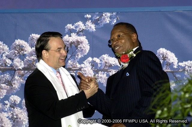Rev. Dr. James P. Page gave the invocation for the event. A state senator received strong applause as he testified that cooperation between the religious community and elected officials is crucial to strengthening and improving our community. Rev. Kwak and Dr. Yang spoke, and then Hyun Jin nim took the podium. There was overwhelming support from young people in the audience. As they followed the speech, they would shout in emphasis of certain statements, such as "where there's a will there's a way, especially when it's the will of God." This excited the whole audience, as the feeling of youth taking ownership of the family and blessing movement is most inspiring.