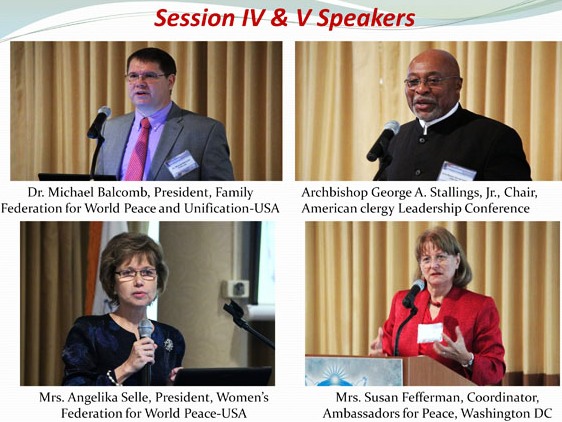 On the second day, Archbishop George Stallings, Chair of the American Clergy Leadership Conference, spoke on the family as an essential component for building healthy communities and nations. Dr. Michael Balcomb, President of the Family Federation for World Peace and Unification-USA, presented a PowerPoint on the need to support and protect the family; and Rev. Angelika Selle, President of the Women's Federation for World Peace-USA, spoke on the role of women in creating healthy families.