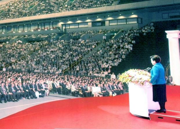 I am completely overwhelmed with emotions through this rally commemorating the fifty-fifth anniversary of mission work in Japan. That was a time when diplomatic relations between Korea and Japan had not been normalized yet. However, Father, the True Parent of Heaven, Earth, and Humankind had thought of this day. You must not forget that present-day Japan exists because of True Parents' forgiveness, love and the grace of the Blessing.